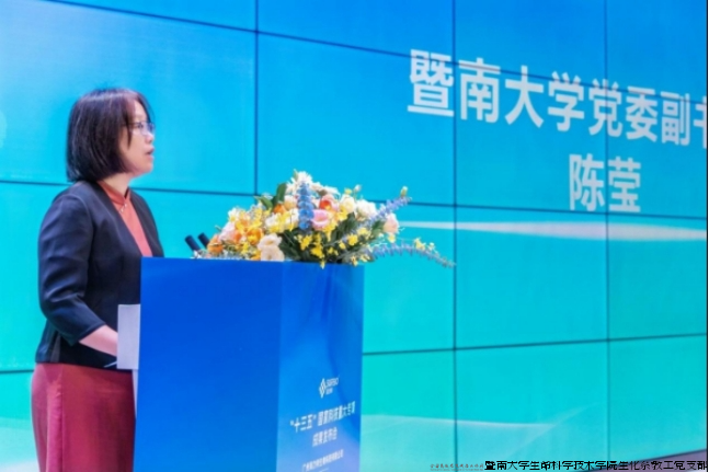 暨南大学党委副书记陈莹在致辞中回顾了暨南大学在服务国家战略、支持科研人员发展新质生产力方面的创新实践和价值追求,表示暨南大学将继续大力支持校企合作,携手各方,以开放的心态、务实的行动促进创新链产业链资金链人才链“四链”深度融合,为持续发展新质生产力贡献力量。