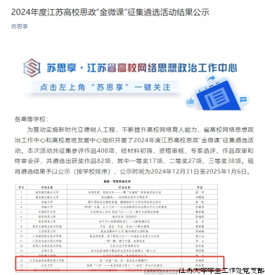 近日,江苏省高校网络思想政治中心、江苏高校易班发展中心公布2024年度江苏高校思政“金微课”征集遴选活动结果,江苏大学荣获一等奖1项,三等奖1项。