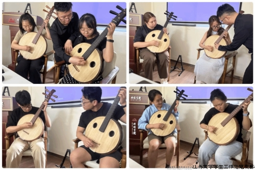 作为北固书院美育课堂第二讲,镇江市青年民乐团朱文军老师带来中阮专题讲座。他从乐器起源、音色特点讲到经典曲目《丝路驼铃》,并现场演示 “弹、挑、扫、轮” 等技法。在实践环节,同学们分组体验中阮弹奏,悠扬的乐声中洋溢着对中华文化的认同与自豪。