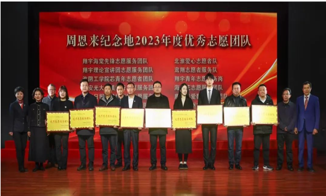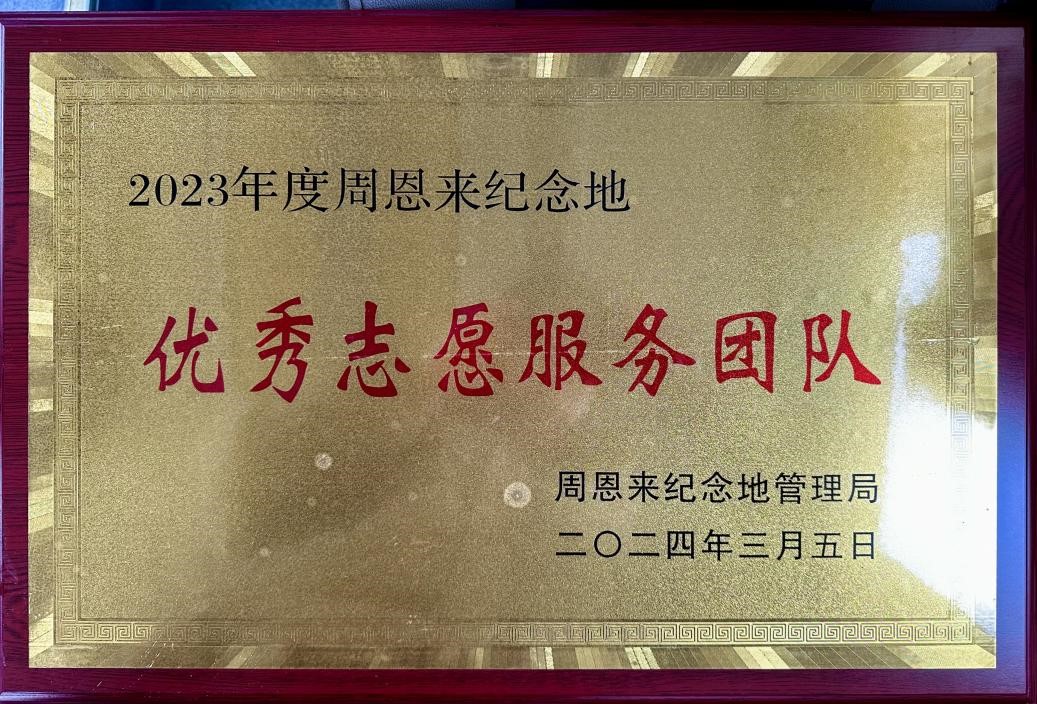 在此次活动中,马克思主义学院海棠花志愿服务团队荣获2023年度周恩来纪念地优秀志愿者服务团队荣誉称号,由马克思主义学院书记、院长侯林为代表上台领奖。