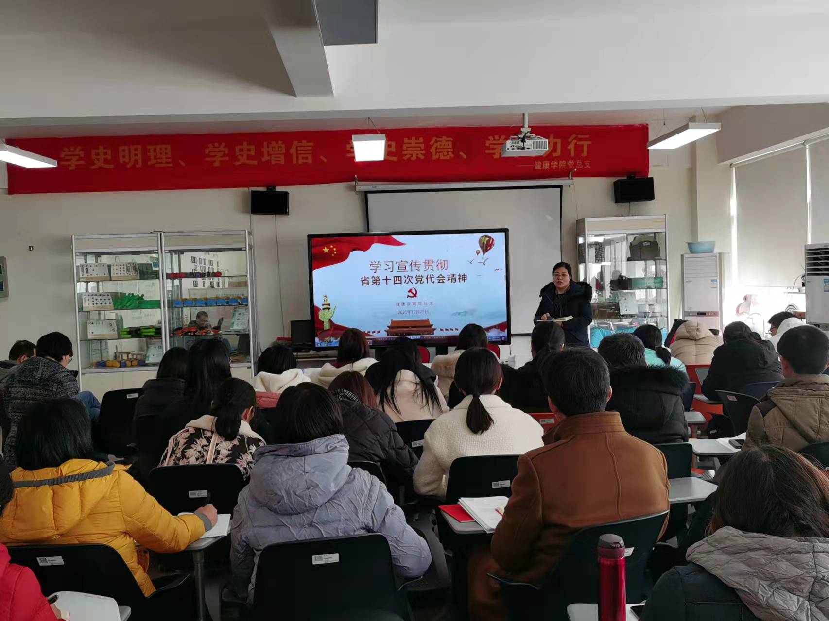 12月29日下午,健康学院党总支组织学习宣传贯彻江苏省第十四次党代会精神。党总支副书记葛伟丽主持学习,向学习成员传达党代会精神。学院领导和党员教师参与学习此次党代会的报告内容。学习内容如下: