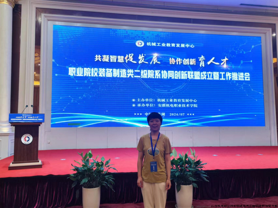 2024年7月17日,由机械工业教育发展中心(机械行指委)主办、安徽机电职业技术学院承办的“职业院校装备制造类二级院系协同创新联盟成立暨工作推进会”在安徽芜湖举行。近年来,我校深化产教融合,推动实施各项改革项目,于2023年11月成功获得第三批国家级职业教育教师创新团队建设项目的立项。此次会议作为全国职业院校装备制造类二级院系协同创新联盟组建的里程碑,电气工程学院工业机器人技术教研室主任管菊花老师作为国家级教师创新团队的核心成员,受邀参加了此次会议。