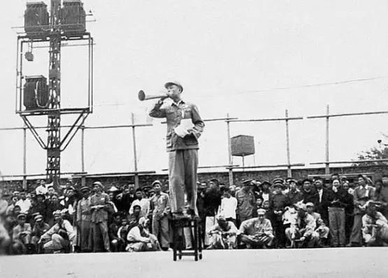 △1952年,中国人保员工利用自制喇叭筒在广场上宣传保险。