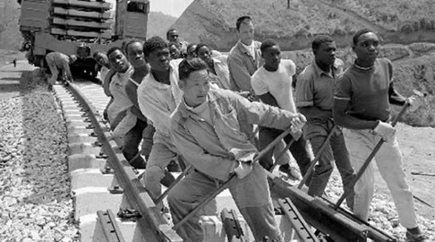 纪录片《坦赞铁路在建设中》:尽管头顶骄阳似火,手里钢轨烫人,坦赞工人和中国工程技术人员下定决心,排除万难,同心协力,争分夺秒,为机械铺轨创造条件。这是坦赞铁路的起点——达累斯萨拉姆库拉西尼车站……两支铺轨队分头由达累斯萨拉姆和姆林巴开始铺轨。