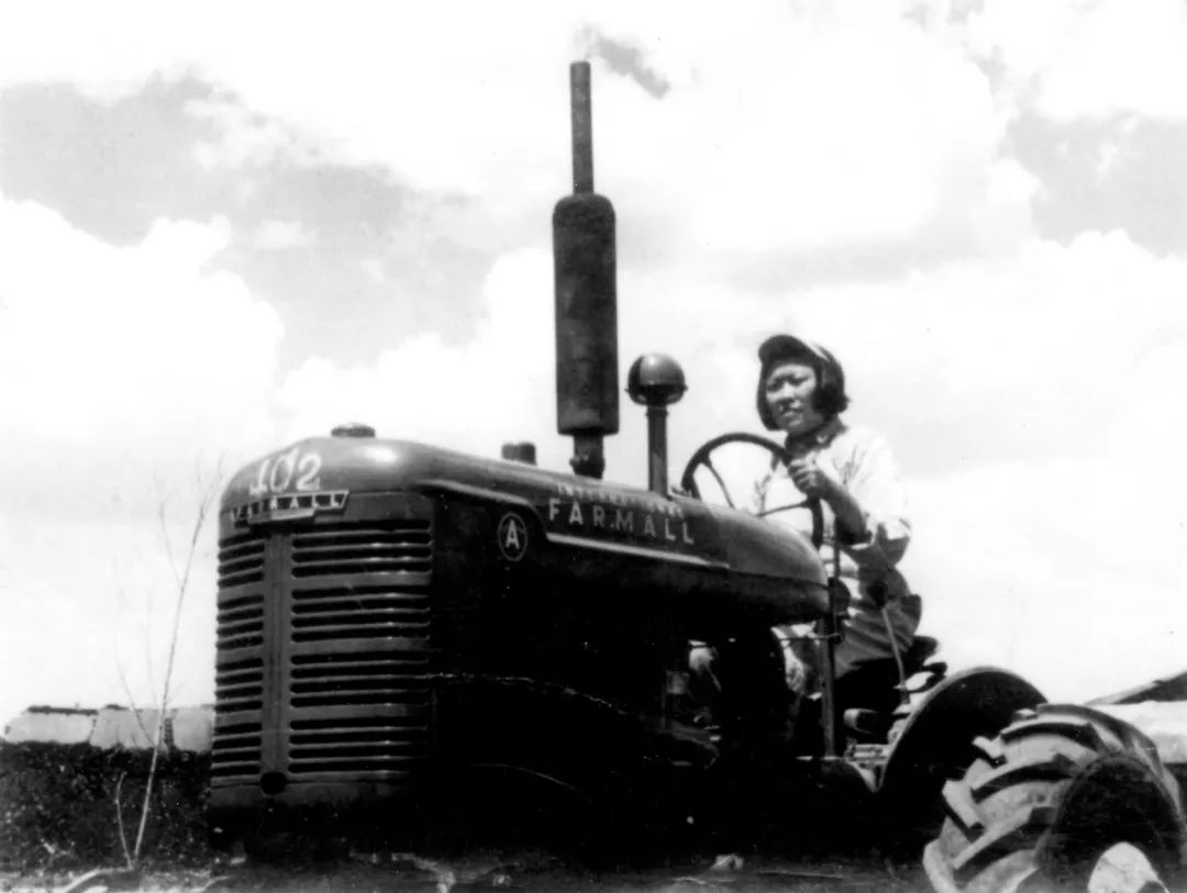梁军:前面开着拖拉机,后面跟一帮人在那看,(说)这大姑娘还开火犁呢。我觉得我不单是翻身解放了,而且能掌握现代的机械动力了。