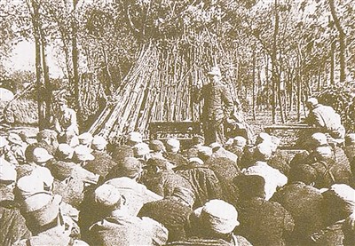 △八路军驻晋办事处主任彭雪枫正在干部会上作动员报告,他的演讲曾给贺绿汀带来《游击队歌》的创作灵感。