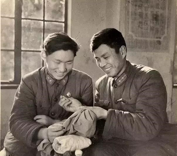 △八连指导员王经文(右)在教战士缝补衣服