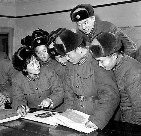 △正准备拍摄电影《霓虹灯下的哨兵》时,演员陶玉玲(左一)向战士们讲解剧情。