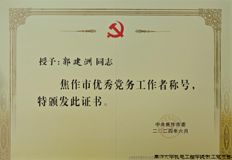 7月1日,在庆祝中国共产党成立103周年之际,焦作市“两优一先”表彰大会在圆形报告厅召开,共同庆祝党的生日,表彰全市优秀共产党员、优秀党务工作者、先进基层党组织。我院党总支书记郭建洲同志被授予“焦作市优秀党务工作者”荣誉称号。