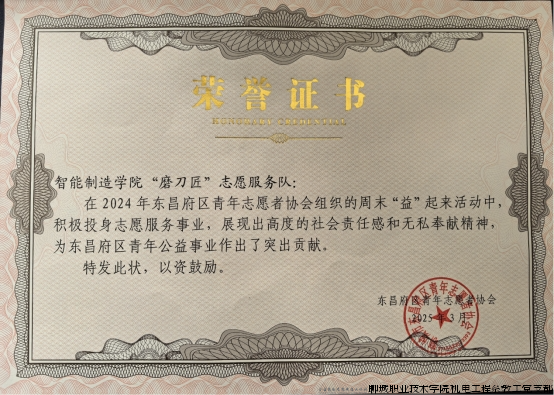 聊城职业技术学院智能制造学院教工党支部培育的“磨刀匠”志愿服务队在2024年周末“益”起来活动中,表现优异,获得由团区委与东昌府区青年志愿者协会联合颁发的优秀志愿服务队荣誉证书,以表彰志愿者在过去一年里为东昌府区青年公益事业作出的突出贡献。
