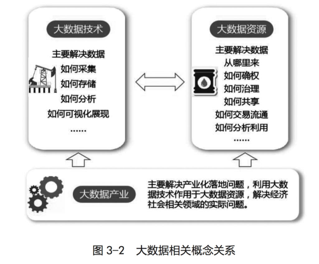 理解大数据,首先要搞清楚大数据技术、大数据资源和大数据产业的关系。这三个概念容易相互混淆,形象比喻,这三者的关系就如同石油钻探开采提炼技术、石油资源与石油产业一样既紧密联系又各有不同。