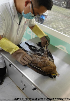 图1 收容救护中心主任、学院党员示范岗王先坤同志在给受伤的蛇雕做检查