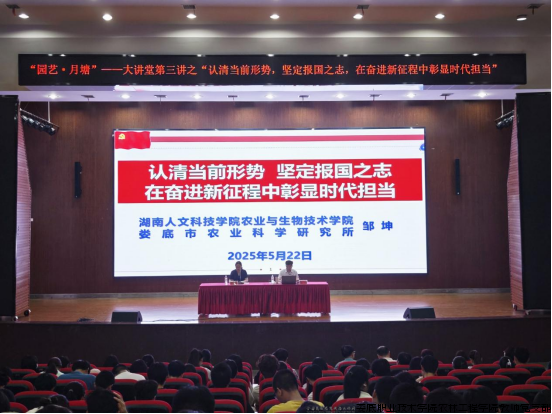 2025年5月22日,湖南人文科技学院农业与生物技术学院党总支书记邹坤,在新培楼报告大厅为娄底职业技术学院农林工程学院师生举办了一场题为“认清当前形势,坚定报国之志,在奋进新征程中彰显时代担当”的专题讲座。此次讲座旨在洞察时代发展趋势,强化报国信念,并在新的征程中承担起责任,为时代贡献奋斗的成果。农林工程学院副院长谢大识、王琦,以及园艺园林及农村新型经济组织管理教研室的全体教师,还有园艺“楚怡工匠计划”班和农村新型经济组织管理(村干部定向培养方向)、园林、园艺专业的学生共600余人参与了讲座。讲座由农林工程学院党总支书记王冬青主持。