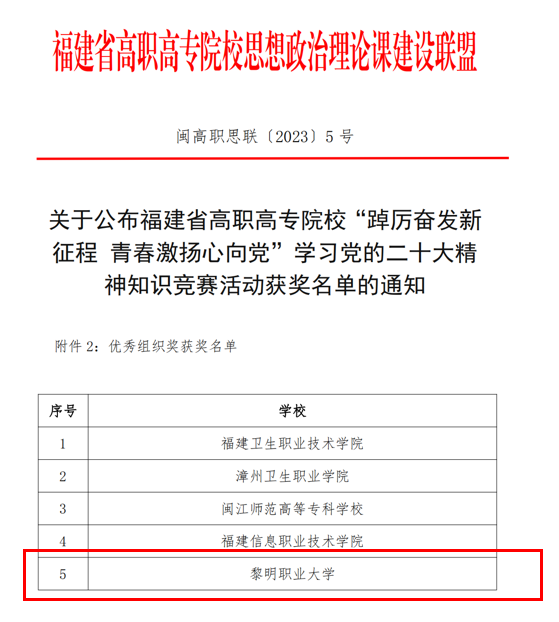 为深入学习贯彻党的二十大精神,深入实施大学生马克思主义自主学习行动计划,落实习近平总书记关于青年工作的重要思想,由福建省高职高专院校思想政治理论课建设联盟主办,闽江师范高等专科学校、福建信息职业技术学院承办的福建省高职高专院校“踔厉奋发新征程 青春激扬心向党”学习党的二十大精神知识竞赛活动面向全省高职高专院校、依托超星学习通平台进行。