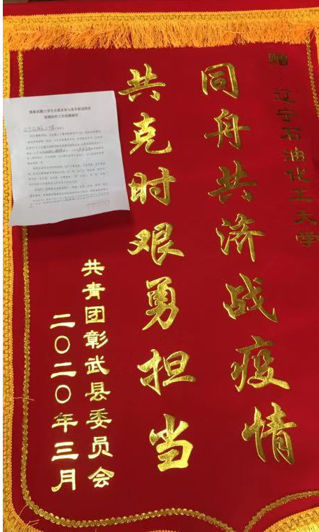 “同舟共济战疫情,共克时艰勇担当”锦旗上的每个字都醒目而厚重。近日,我校收到彰武县共青团委员会对于石油天然气工程学院能源与动力工程专业本科生党支部积极分子段佳雨同学在抗击疫情期间作为优秀志愿者的感谢信和锦旗。用雷锋精神建校育人是我校长期坚持的办学理念,从我校建校以来,一直积极引领广大师生播撒雷锋精神的种子,段佳雨同学自入学以来一直以雷锋为榜样,将“雷锋精神”传递给身边更多的人,用实际行动践行青年一代的责任和担当。