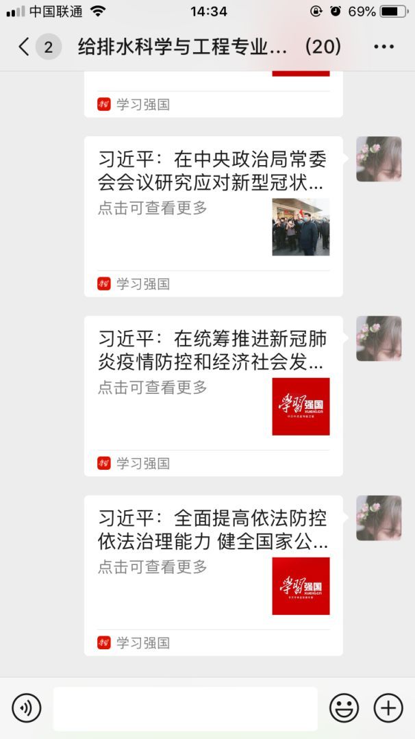 时值新冠病毒肺炎疫情防控工作的关键时期,为深入贯彻习近平总书记疫情防控指示精神及党中央决策部署、积极发挥党支部战斗堡垒作用和党员先锋模范作用,石油天然气工程学院给排水科学与工程专业本科生党支部充分利用“学习强国”学习平台组织召开党员视频大会。会议由支部书记郭紫薇主持,全体支部学生党员参加。