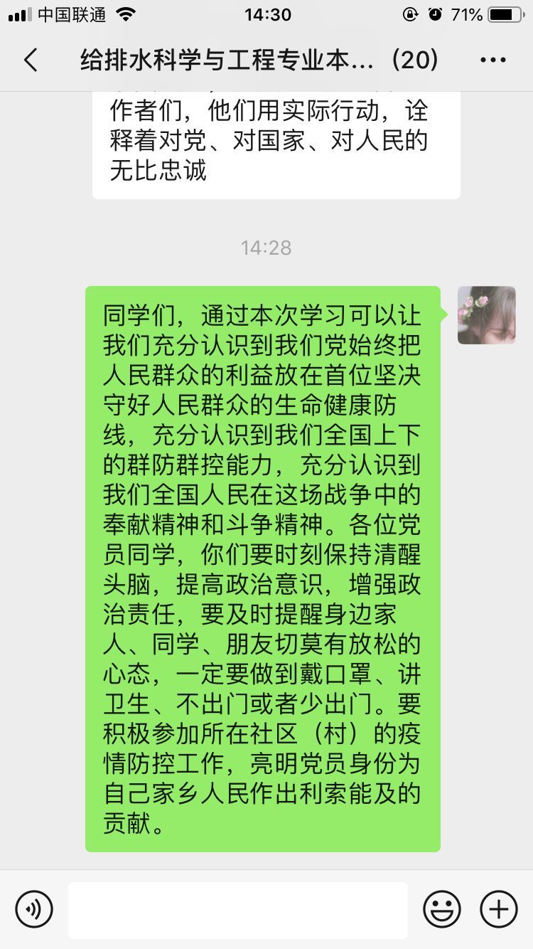 会议最后,支部书记郭紫薇谈到通过本次学习可以让我们充分认识到我们党始终把人民群众的利益放在首位坚决守好人民群众的生命健康防线,充分认识到我们全国上下的群防群控能力,充分认识到我们全国人民在这场战争中的奉献精神和斗争精神。每日上报的数据务必真实可靠,要严格落实学院和地方政府各方面要求;对于急切想返校的同学,要安抚他们的情绪,坚决不得提前返校;党员要以身作则,主动在班级中宣传抗疫知识,了解学生们居家、学习的困难,并及时向组织反映以解决问题。
