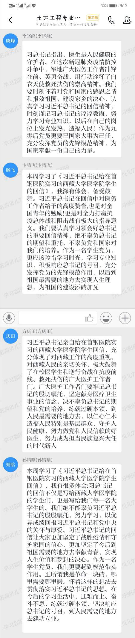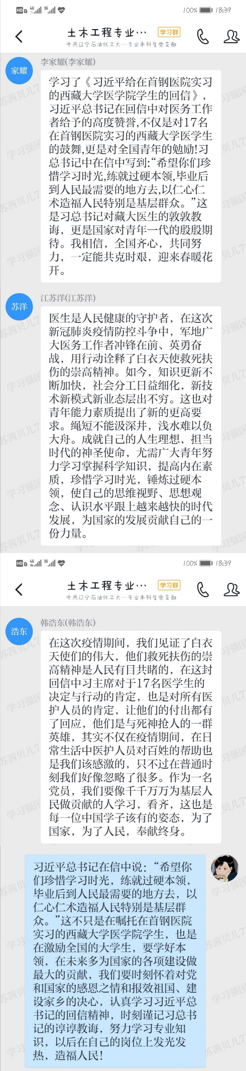 为深入学习贯彻习近平总书记给西藏大学医学院在首钢医院实习学生的回信中重要指示精神,牢记习近平总书记的殷切教诲,加强学生党员的思想建设。4月11日下午,石油天然气工程学院土木工程专业本科生党支部“云端”学习《习近平总书记回信勉励在首钢医院实习的西藏大学医学院学生》,全体支部党员参加,会议由支部书记宁璇主持。