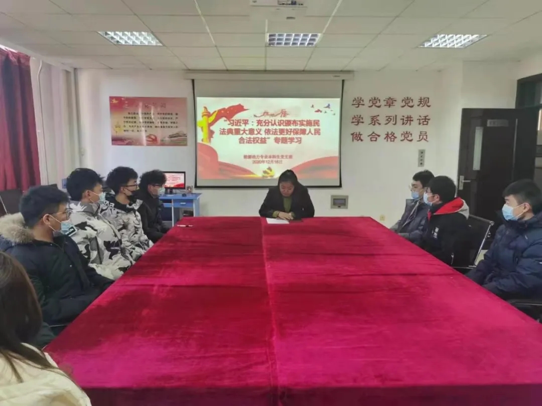 为深入贯彻落实第十三届全国人大三次会议审议通过的《中华人民共和国民法典》,2020年12月16日,石油天然气工程学院能源与动力工程专业本科生党支部在储运楼309召开全体党员理论学习会议,集中学习《中华人民共和国民法典》。支部全体学生党员参加,会议由支部书记张国花主持。