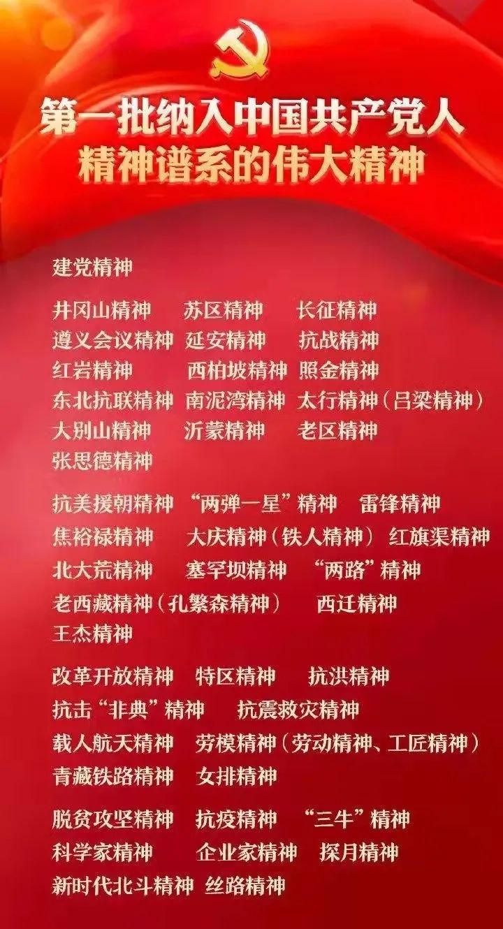 2021年,党中央批准了中央宣传部梳理的第一批纳入中国共产党人精神谱系的伟大精神。
