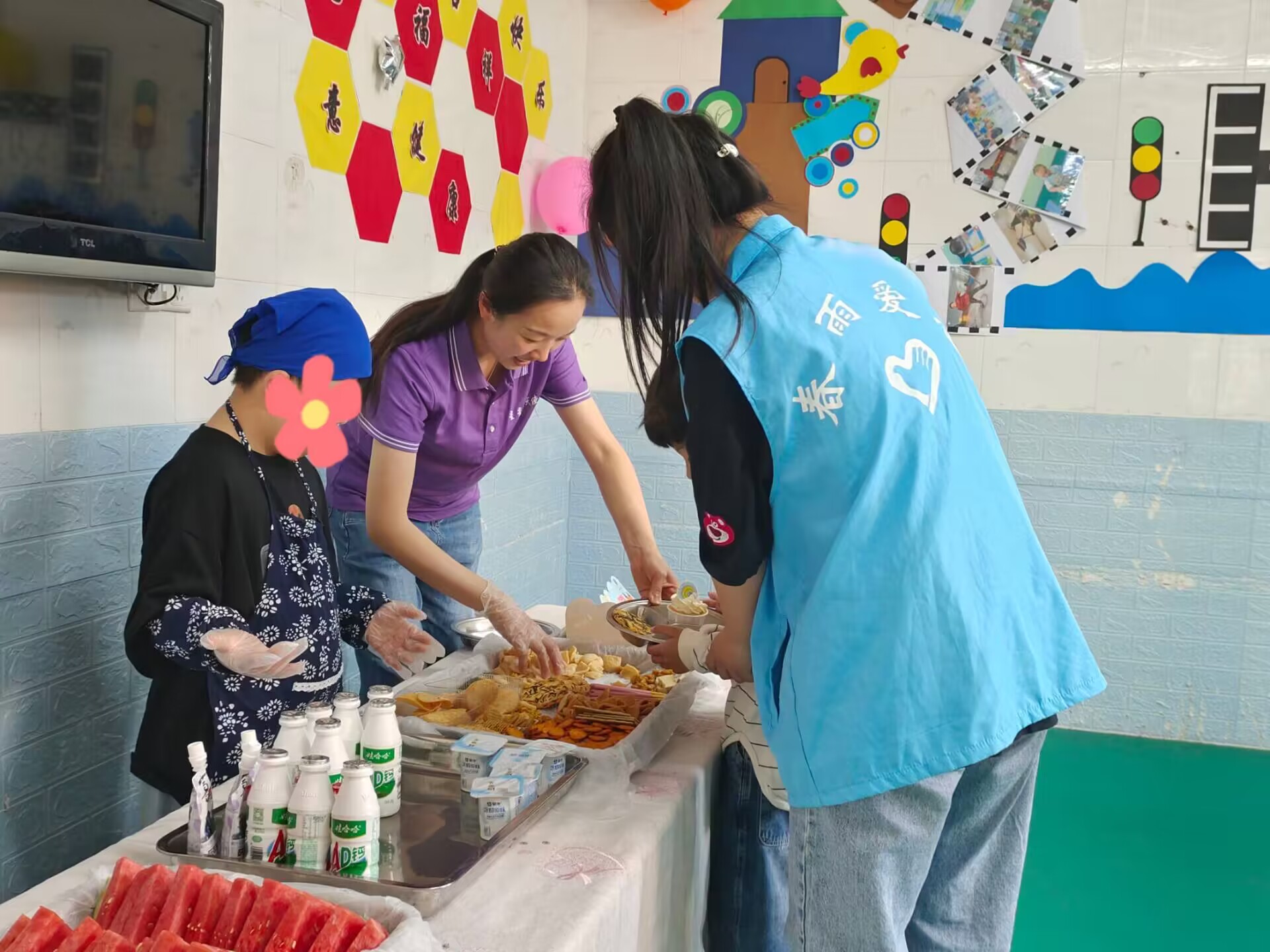 随后,志愿者向孩子们分发事先准备好的点心和饮料,孩子们秩序井然地领取并享用。