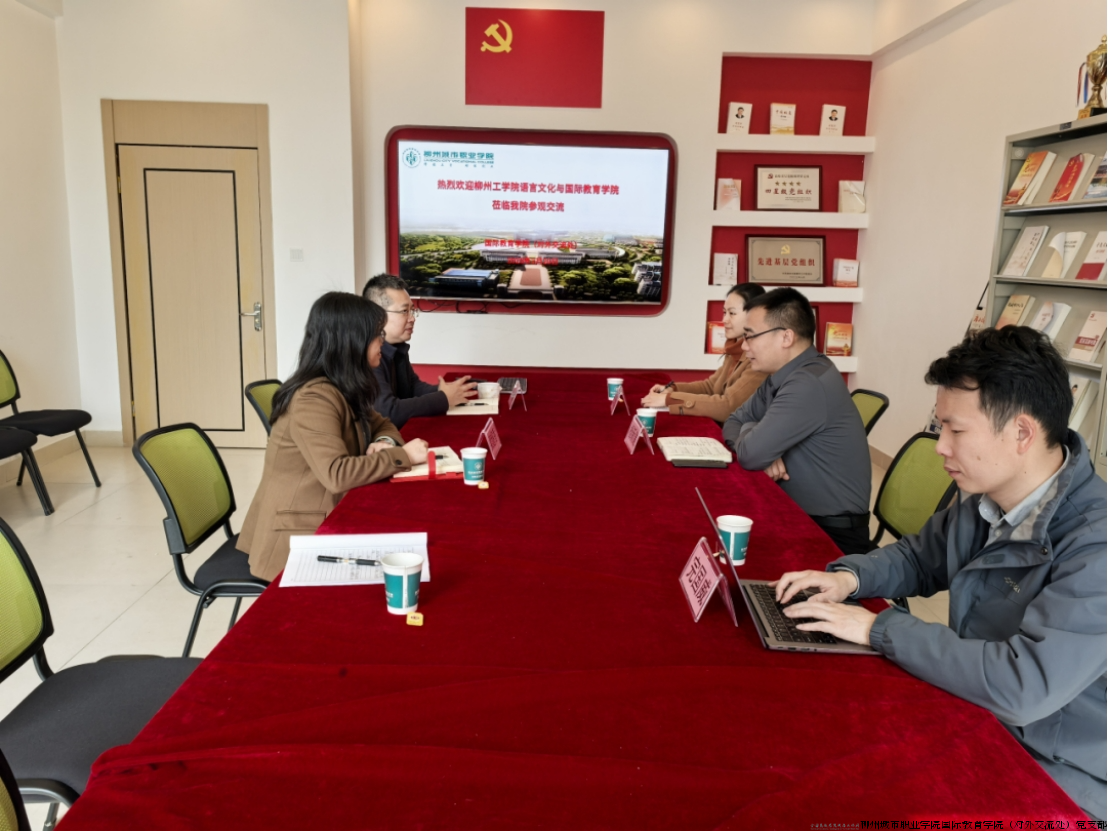 3月20日,为深化职业教育国际交流与合作,探索产教融合创新路径,柳州工学院语言文化与国际教育学院党总支书记杨新建、汉语国际教育专业教研室主任兰慧君、汉语国际教育专业教研室副主任完国威一行到柳州城市职业学院国际教育学院开展访问交流活动。我校国际教育学院(对外交流处)党支部书记梁超香、国际教育学院(对外交流处)李谦院长参加交流活动。