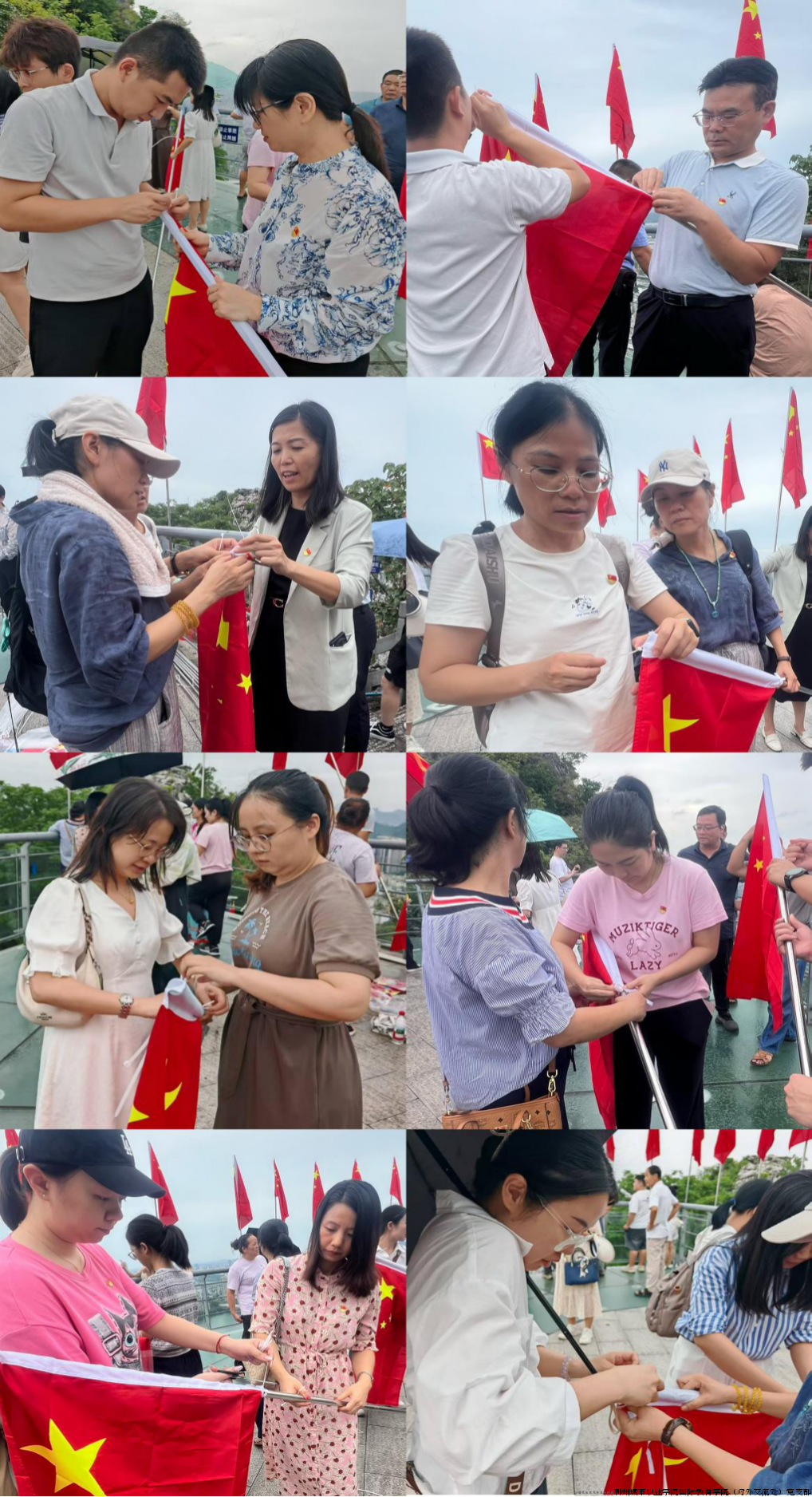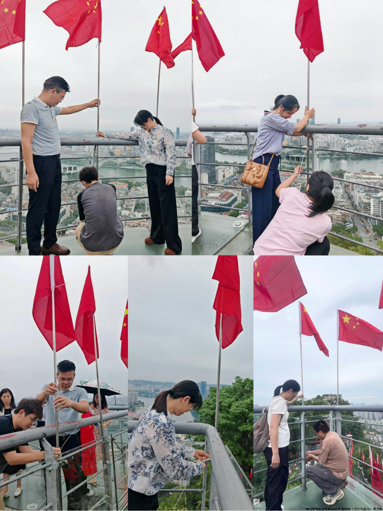 经过有序布置,近百面五星红旗迎风招展,与柳州城市美景相互映衬,形成一片红色的海洋。绚丽的“中国红”不仅点燃了城市的节日气氛,也吸引大量市民和游客驻足观看、合影留念,成为一堂流动的爱国主义教育课。活动最后,全体党员列队肃立,齐声高唱《我和我的祖国》,“我和我的祖国,一刻也不能分割……”深情而激昂的歌声在山谷间回荡,表达了对祖国深沉的热爱与美好的祝福。