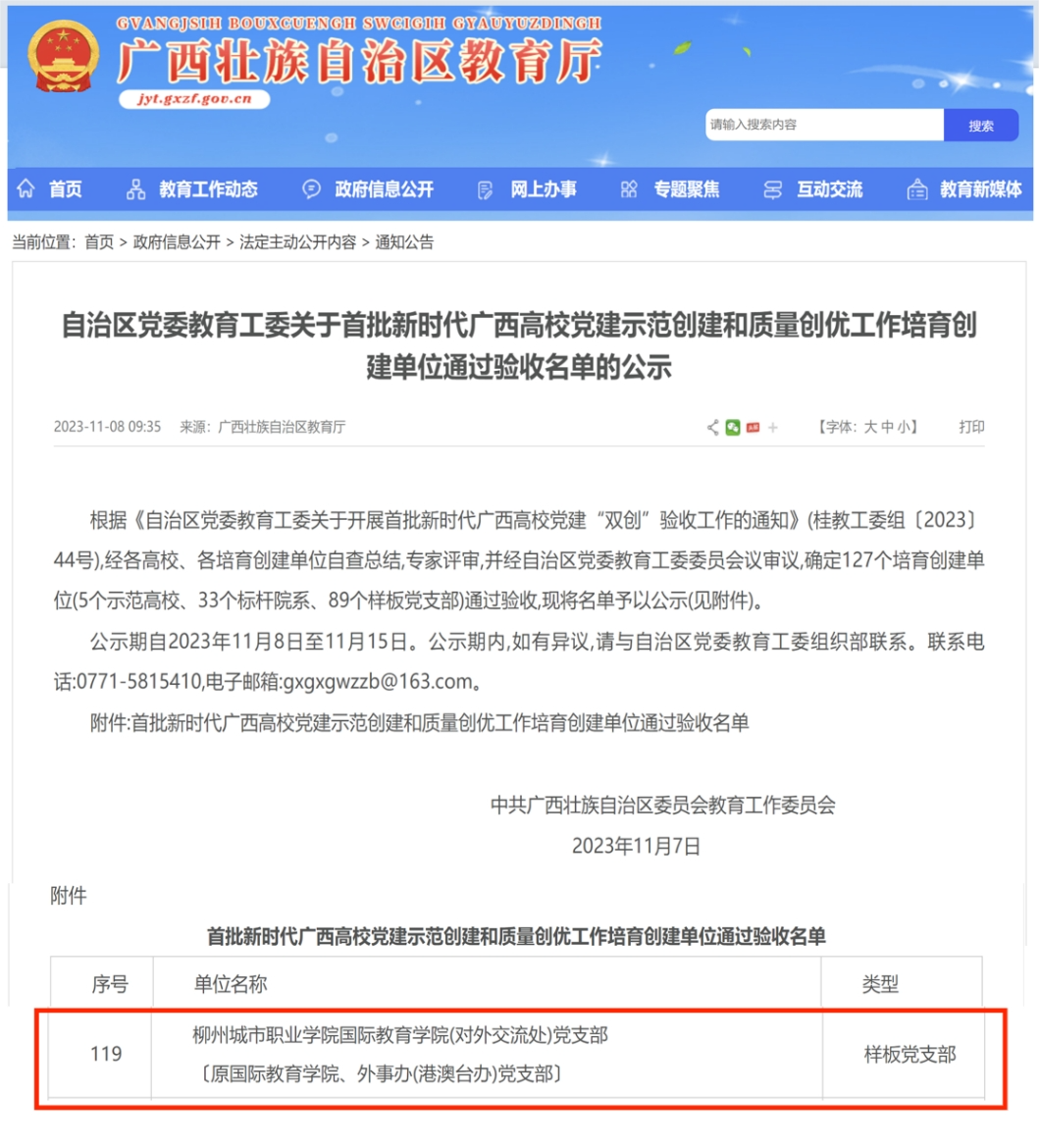 近日,自治区党委教育工委下发《关于公布首批新时代广西高校党建示范创建和质量创优工作培育创建单位验收通过名单的通知》,我校国际教育学院(对外交流处)党支部顺利通过“首批新时代广西高校党建工作样板支部”建设单位验收。