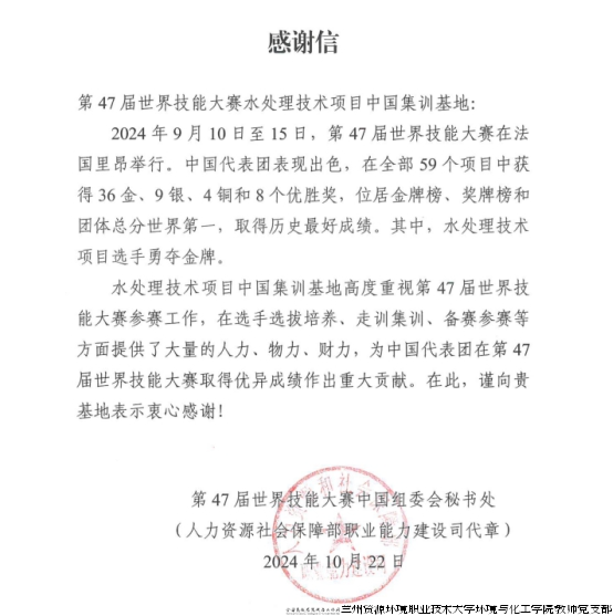 9月10日—15日,第47届世界技能大赛在法国里昂举办,中国代表团派出68名选手参加全部59个项目比赛,获得36枚金牌、9枚银牌、4枚铜牌和8个优胜奖的优异成绩,位居金牌榜、奖牌榜和团体总分首位。其中,水处理技术项目为中国代表队再次摘得金牌。学院作为第47届世界技能大赛水处理技术项目中国集训基地因在选手选拔、走训集训、备赛参赛等工作中做出的贡献获得人力资源和社会保障部致函感谢。