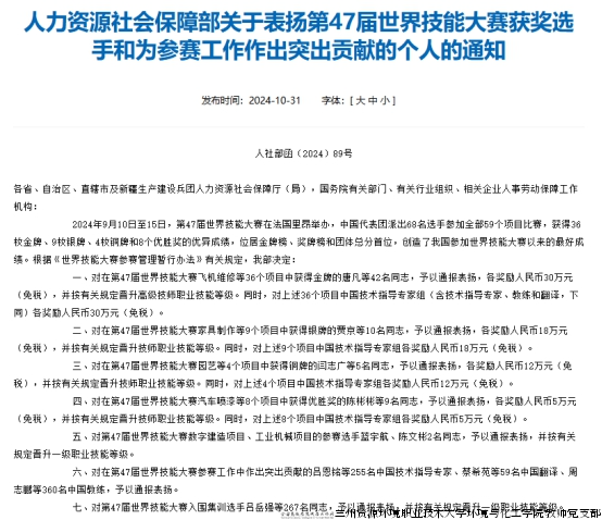 同时,人力资源社会保障部发布《关于表扬第47届世界技能大赛获奖选手和为参赛工作作出突出贡献的个人的通知》,对第47届世界技能大赛的获奖选手和突出个人予以表彰奖励。环境与化工学院教师党支部赵文青老师受到通报表扬。