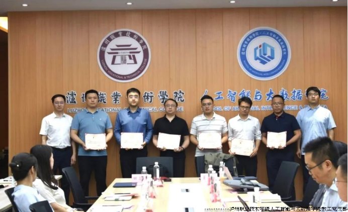 鲍学东为来自重庆电子科技职业大学、四川邮电职业技术学院、华为、科大讯飞、安恒信息等单位的15位专家颁发了聘书并合影。