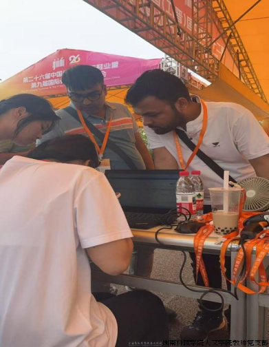 博览会现场,党员师生充分发挥先锋模范作用,带领师生志愿者活跃在展会各个岗位。在入场引导处,他们面带微笑,热情地为海内外客商指引方向;接待翻译岗位上,师生们凭借扎实的语言功底,为中外交流架起沟通桥梁;信息咨询台前,面对客商们关于路线规划、展会活动安排等各类问题,志愿者们凭借专业知识和认真负责的态度,提供细致全面的解答。在办证登记处,师生志愿者们更是耐心细致,有条不紊地完成信息录入与证件发放工作,确保流程高效顺畅。