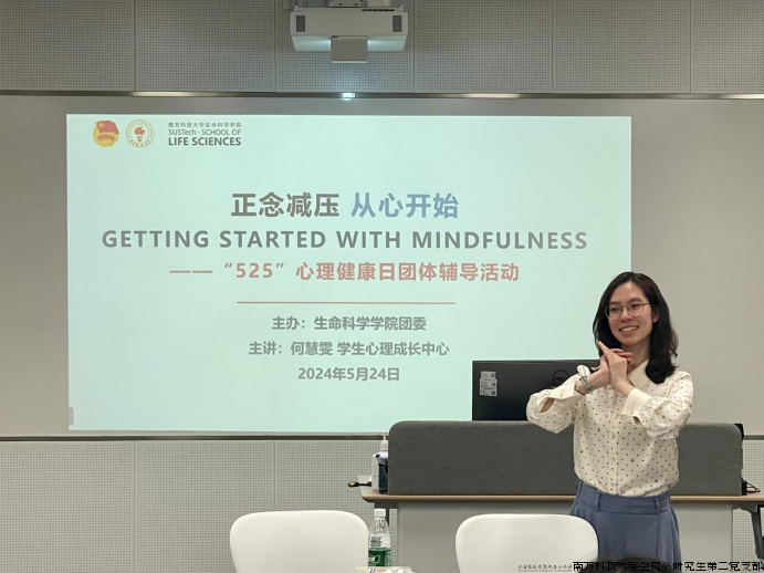 在“5.25”大学生心理健康日,为深入开展大学生心理健康教育活动,提升心理育人工作实效,南方科技大学生命科学学院举办了一场“正念减压·从心出发”的团体心理咨询活动。活动提供了一个开放、安全的环境,让同学们分享他们在学业和生活中所面临的挑战,通过正念冥想练习改善身心、调节情绪、缓解焦虑,并获得专业心理咨询师的支持和指导。