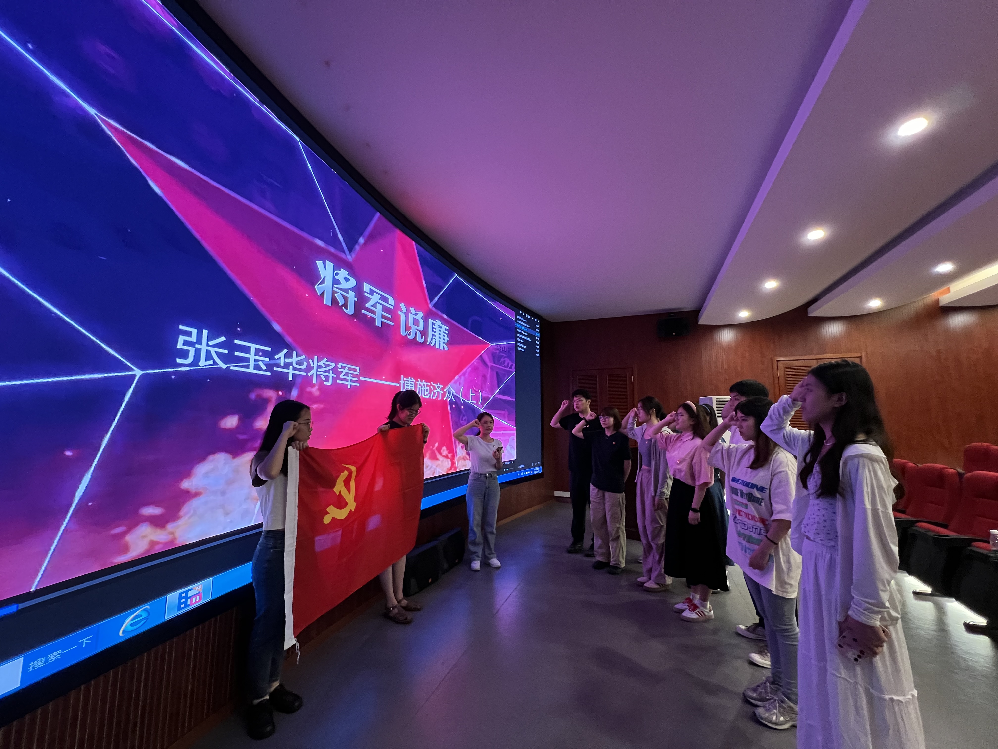 在观看“慈善将军”、原南京军区副政委张玉华讲述的《不忘初心葆本色》清廉故事微视频后,全体参与本次活动的党员同志在党建中心学生负责人雷静的带领下,一起高举右拳,面向党旗,庄严宣誓,重温入党誓词。铿锵有力的宣誓,表达了大家对党与人民的无限忠诚、不忘初心、牢记使命、听党话、跟党走的坚定决心。