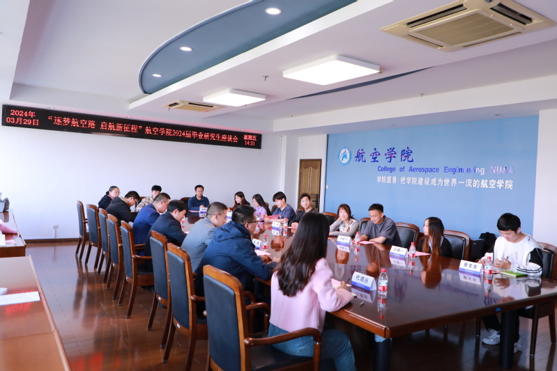 3月29日下午,航空学院召开“逐梦航空路,启航新征程”2024届毕业研究生座谈会。学院党委书记袁智强,院长魏小辉,党委副书记杨杰,导师代表、教学学工代表以及各系所研究生代表参加座谈。会议由杨杰主持。