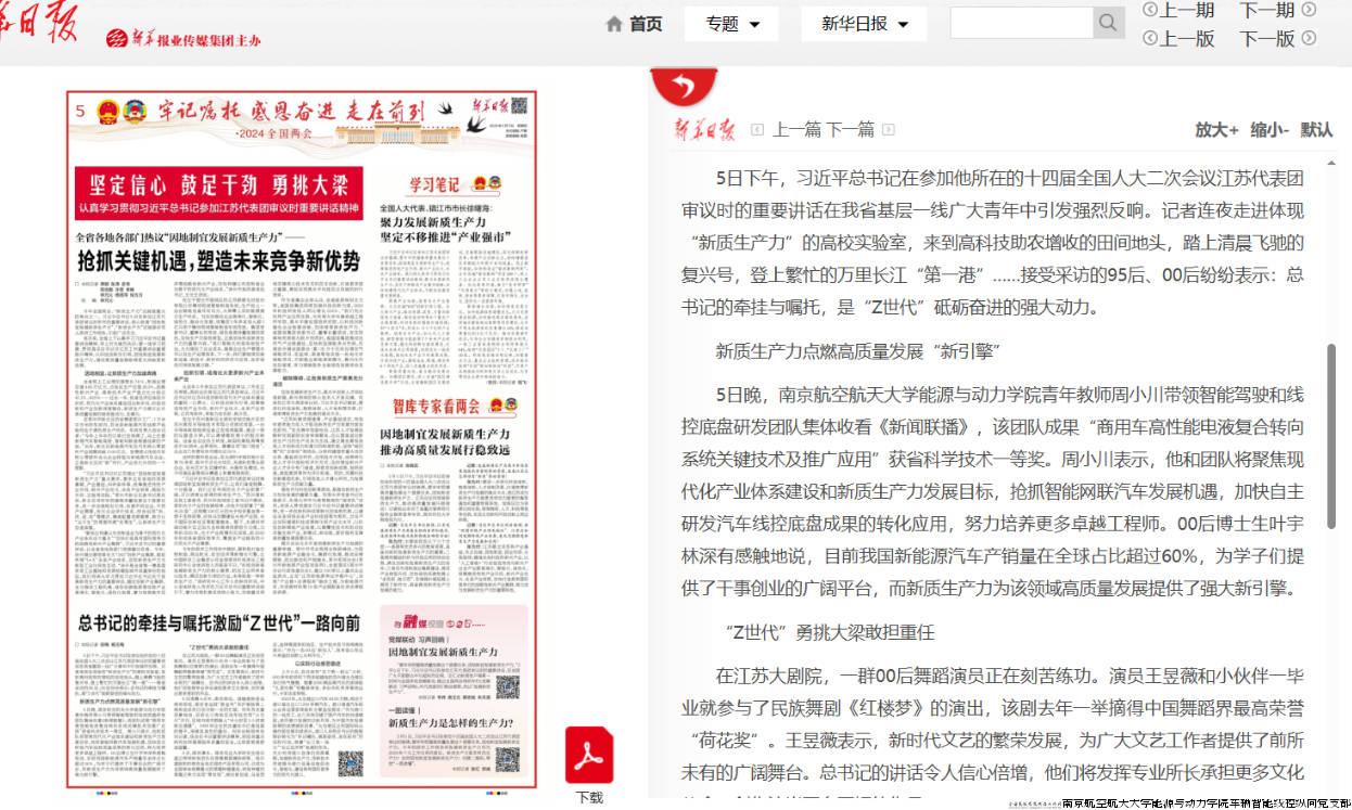 当天,新华日报的记者走进了团队的研发实验室,党支部成员接受了采访。记者提到习近平总书记在参加他所在的十四届全国人大二次会议江苏代表团审议时的重要讲话,并围绕主题“科技高质量发展”与党支部成员展开讨论。党支部成员周小川表示,他和团队将聚焦现代化产业体系建设和新质生产力发展目标,抢抓智能网联汽车发展机遇,加快自主研发汽车线控底盘成果的转化应用,努力培养更多卓越工程师。党支部成员储雨凯深有感触地说,目前我国新能源汽车产销量在全球占比超过60%,为学子们提供了干事创业的广阔平台,而新质生产力为该领域高质量发展提供了强大新引擎。