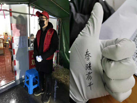 教师院研究生党员的丁维佳同学在寒假期间参与了当地防控疫情的志愿者工作。他的主要工作是在省道边的卡口上进行车辆询问、劝返以及来往人员登记的工作。在他看来,在湿冷的冬日清晨坚守岗位,既是一次奉献、一种锻炼,更是一份对初心的考验。在工作期间,周边热心居民送来了慰问物资,更让他感受到了人们在困难面前守望相助的温暖情谊。