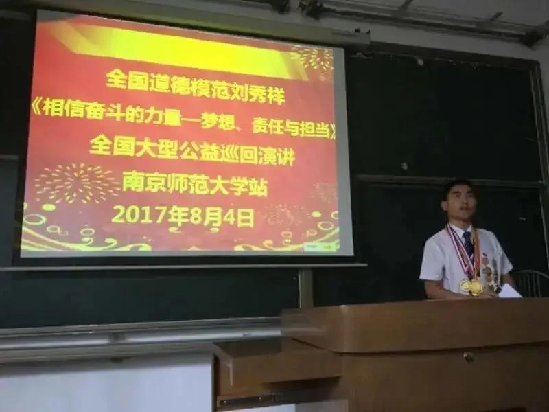 刘秀祥曾说,“我最初想,能改变一两个人就足够了。但我后来想,我不可能只改变一个人。我当班主任,一个班50人,那我就有可能改变50人”。他笑着说,“可能很多年后,我改变的人是500、5000甚至5万”。也就是在意识到自己也可以帮助更多人的时候,他开始致力于公益。他曾一对一资助过贫困学生1700多人,开展过公益励志演讲1000多场次,他的求学故事温暖与激励了很多人。2017年8月刘秀祥也带着他的求学故事在自己的母校南京师范大学,为南师的同学们带来了题为《相信奋斗的力量——梦想、责任与担当》的精彩演讲。