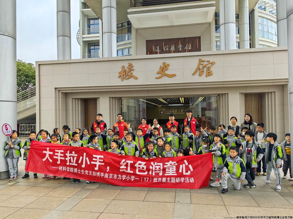 2024年3月28日,南京邮电大学材料科学与工程学院博士生党支部携手南京市力学小学一(17)班开展“大手拉小手,红色润童心”主题研学活动。博士生党支部部分党员、入党积极分子以及南京市力学小学一(17)班师生一行近60人参加。本次活动是博士生党支部开展的面向社会的党群共建志愿服务活动,得到了学院党委以及学院新能源材料与器件系党支部的大力支持。