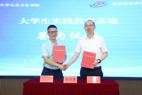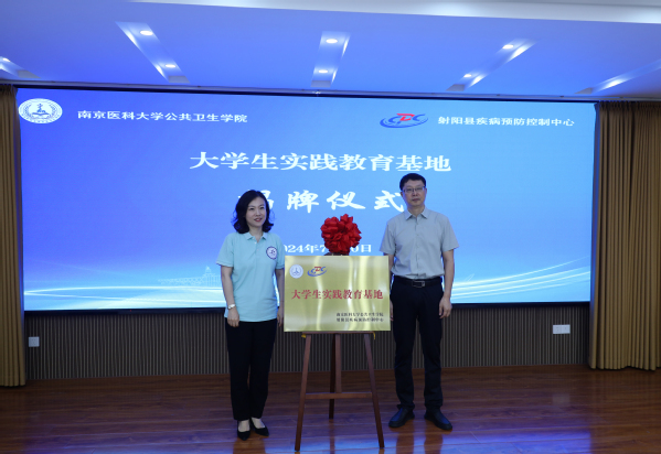 最后,公共卫生学院党委副书记、副院长毛曦与射阳县疾控中心主任戴曙光签署大学生实践教育基地共建协议,学院党委书记盛彤彤与射阳县卫健委副主任、疾控局局长高军为大学生实践教育基地揭牌。