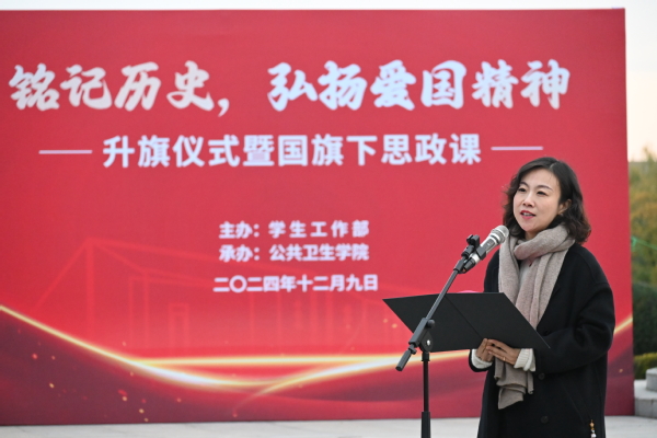 12月9日早晨7:00,我院举行“铭记历史,弘扬爱国精神”升旗仪式暨国旗下的思政课,本次活动由学生工作部主办、公共卫生学院承办。公共卫生学院党委书记盛彤彤、副书记毛曦,全体辅导员,学生党员和本研学生代表200余人参加了活动。活动由学院分团委书记何秋惠主持。