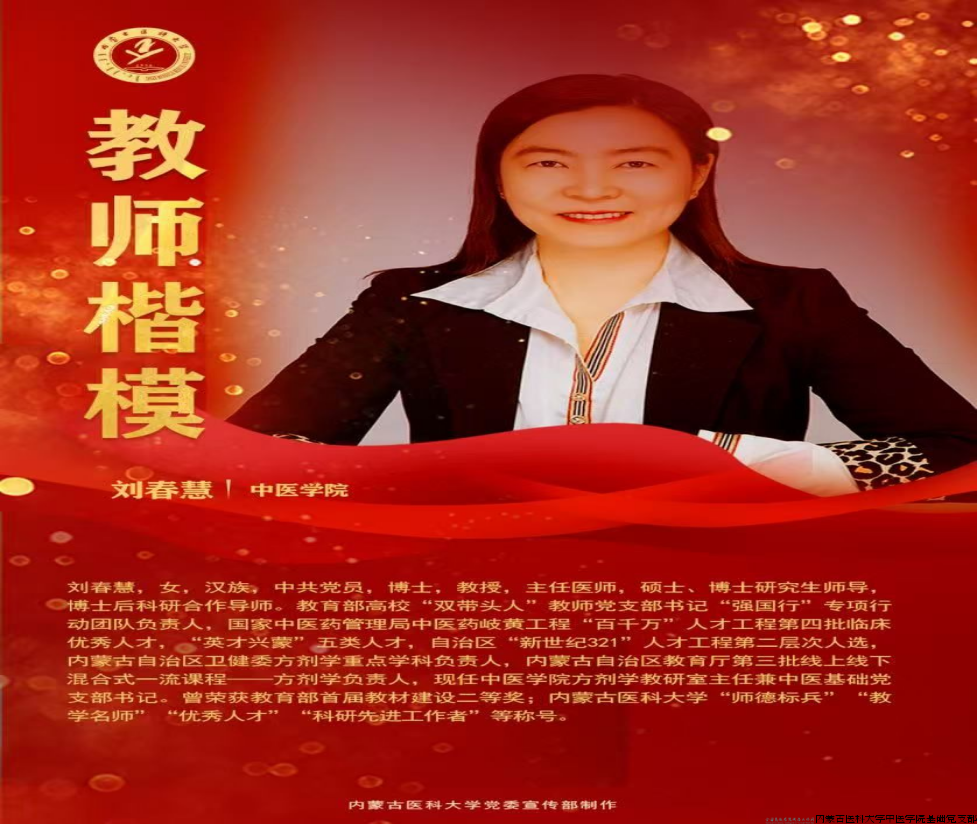 刘春慧老师作为教育部高校“双带头人”教师党支部书记“强国行”专项行动团队与“内蒙古自治区坚强堡垒模范支部”的双重负责人,她以深厚的仁爱之心和开拓创新的精神,立足中医药事业,不遗余力地推动“方剂学学科”的发展,凭借深厚的学术造诣,在中国社区医师协会论坛、首届方剂学课程思政年会等权威学术平台上发表学术报告,分享前沿见解与研究成果,为学校学科发展注入新的活力。