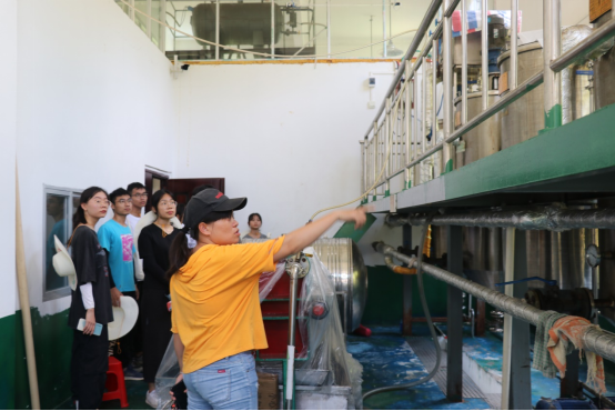 返程之际,谭畅老师组织同学们前往绿浪村特色产业基地油茶榨油坊进行参观。到达目的地后,榨油坊工作人员带领同学们参观了山茶油产业直播培训室、生产工艺车间、包装车间,并为同学们介绍了原材料、车间仪器和生产流程,使同学们对村里的山茶油产业有了进一步的了解,大家自发地拿出手机扫码关注山茶油直播间,并表示会尽力向身边的亲朋好友宣传推广山茶油,帮助推动茶油消费从小众化走向大众化,被更多群众知晓,为绿浪村产业振兴助力加“油”。