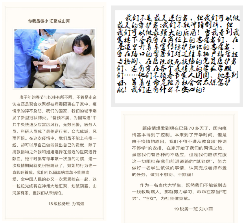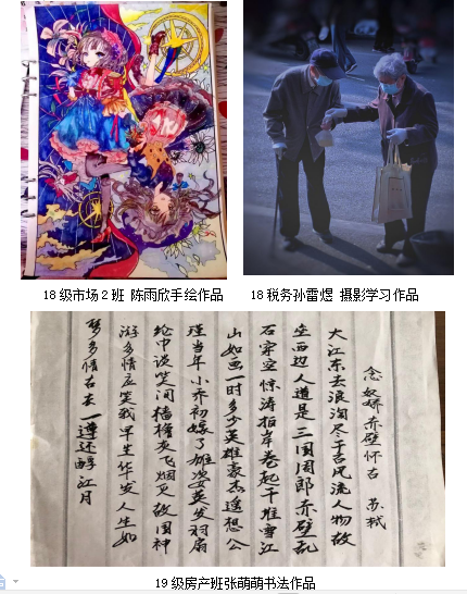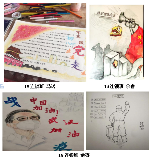 疫情期间除了学习,兴趣爱好的发展也是必备科目,同学们画风细腻,笔锋苍劲有力,摄影作品情感充沛。19连锁班的余睿同学绘画的钟南山院士和抗击疫情的白衣天使们,生动形象地表达了医护人员在疫情面前不屈不挠的精神,更是表现出了青年学子守护华夏的决心。