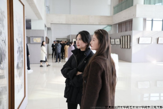 开幕式后,与会领导、党员代表、师生代表共同参观了廉洁文化主题中国画作品展。此次活动共展出了马宝军老师不同风格、不同形式的70多幅廉洁绘画作品,其中大多数作品于今年11月初在银川市美术馆展出。书画展现场气氛热烈融洽,在一幅幅技艺高超、意境深远的艺术作品前,与会领导与马宝军老师亲切交流创作思路与深刻内涵。参观画展的党员代表、师生代表纷纷驻足观赏,赞叹绘画作品展现的艺术之美和廉洁之蕴,表示通过书画展更加深刻地感受到廉洁奉公这一中华优秀传统美德,今后将更加注重廉洁修身、廉洁育人,共同营造风清气正的校园环境。