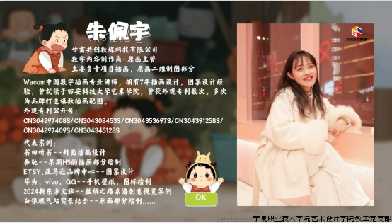 讲座主讲人朱佩宇女士,现任甘肃共创数媒科技有限公司原画主管,并兼任Wacom中国数字插画专业讲师。她拥有七年插画与图案设计经验,曾参与奔驰、华为、新东方文旅等知名品牌项目,兼具丰富的行业实战与教学背景。