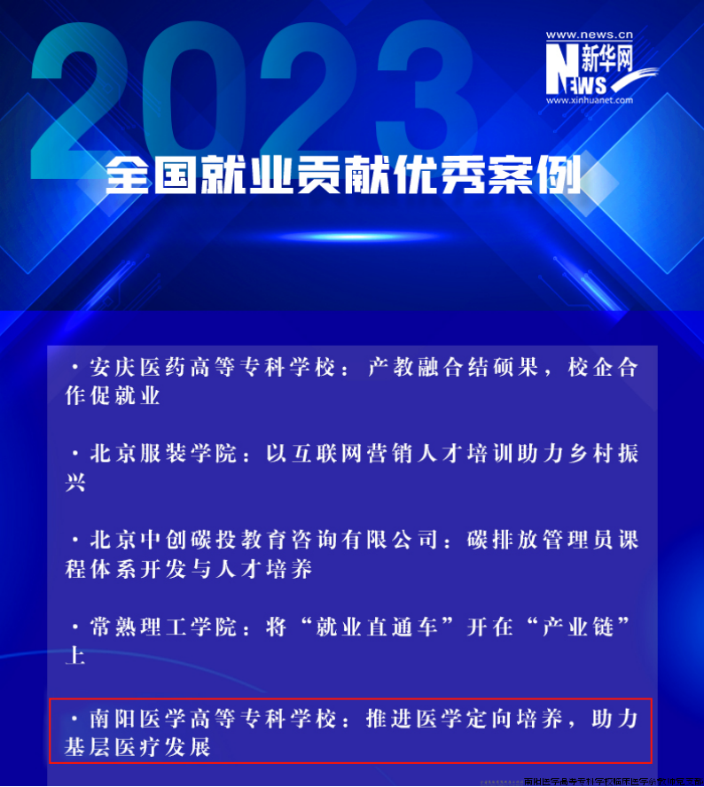 近日,2023年全国就业贡献优秀案例征集结果公布,南阳医专临床医学系“推进医学定向培养 助力基层医疗发展”就业工作案例榜上有名。此项活动由新华网发起,全国推荐材料近百件,经过初评、复审,共遴选推出23个优秀案例。