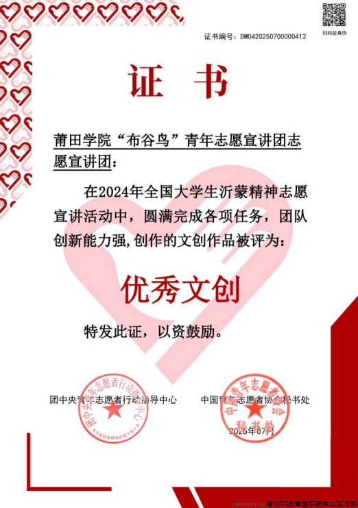 近日,共青团中央青年志愿者行动指导中心、中国青年志愿者协会秘书处联合公布了2024年全国大学生沂蒙精神志愿宣讲项目优秀文创作品名单,由管理学院申报的莆田学院“布谷鸟”青年志愿宣讲团创新能力强,文创作品主题突出,具有鲜明的沂蒙特色和较强的艺术感染力,荣获全国“优秀文创”称号。这是莆田学院“布谷鸟”青年志愿宣讲团继获得2024年全国大学生沂蒙精神志愿“优秀团队”荣誉称号后,又一个全国性荣誉!充分展现了管理学院在沂蒙精神传承与创新中的突出成果。
