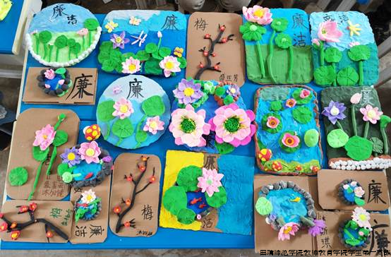 黏土变“廉”土,廉洁驻童心。心随“廉”动,“智”趣盎然。学生党员指导钢厂小学的30名留守儿童开展以“莲”话“廉”黏土教学,以“莲花出淤泥而不染”的特点为切入点,通过揉、捏、搓、贴等方式,充分发挥创造性思维,一片片粉色荷花瓣、绿色莲叶、黄色花蕊的黏土完美搭配形成了一幅幅“以莲促廉”佳作。通过制“莲”的形式,“以莲促廉”, 使廉政文化深入童心,播撒“重德、守正、至善、清廉”的价值理念,弘扬廉洁文化,实现乡村文化建设和艺术普及,发挥出“倡廉于有形、润物于无声”的作用。