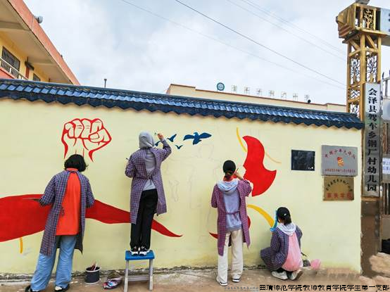 墙体彩绘添色彩,美化环境画文明。一墙一风景,扮靓美好生活,绘钢厂色彩,展少年意气。实践团对钢厂小学斑驳黄旧的两面墙进行设计、彩绘,采用黄、绿、蓝青春洋溢的色彩,勾勒出孩子们活泼的身影,他们或庄严有序参与升旗,或张开双手自由奔跑,展现了少年儿童的蓬勃朝气,同时,画面中的自然元素如飞鸟、飘带等,不仅增添了画面的和谐感,也寓意着孩子们与自然和谐共生,心中向党的美好愿景。旧墙面变成了“高颜值”“会说话”的文化墙,为孩子们营造了一个充满爱与关怀的成长环境,更承载着深远的教育意义,向孩子们传递积极向上价值观。